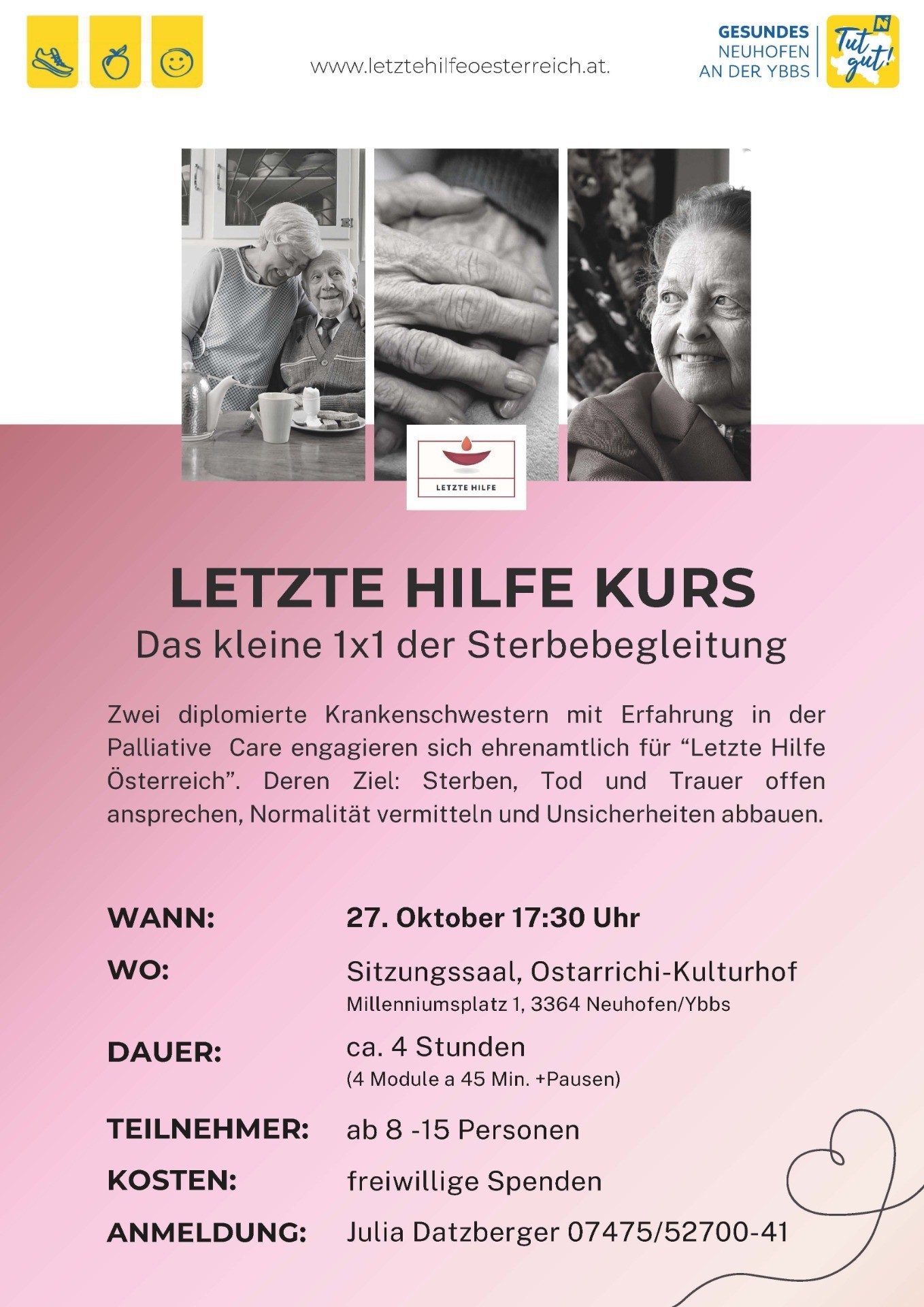 Zwei diplomierte Krankenschwestern mit Erfahrung in der Palliativ Care engagieren sich ehrenamtlich für "Letzte Hilfe Österreich". Deren Ziel: Sterben, Tod und Trauer offen ansprechen, Normalität vermitteln und Unsicherheiten abbauen.