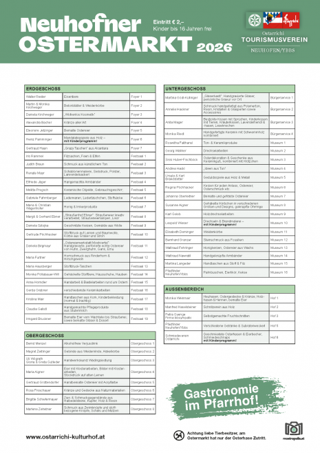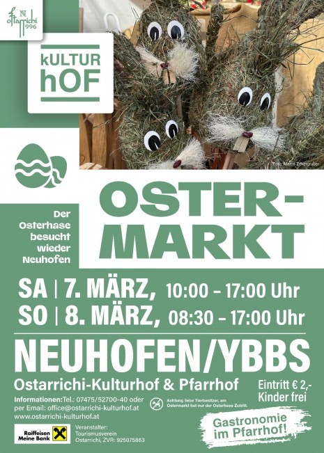 Schon seit vielen Jahren ist der Neuhofner Ostermarkt mit seinem bunten österlichen und frühlingshaften Kunsthandwerkssortiment ein beliebter Fixpunkt im Mostviertler Kulturgeschehen. Mit rund 70 einzigartigen Ausstellern, leckeren Mehlspeisen und einem umfangreichen Kinderprogramm ist der Neuhofner Ostermarkt Anziehungspunkt für die ganze Familie. Lageplan, Parkmöglichkeiten und Ausstellerliste finden Sie kurz vor der Veranstaltung auf unserer Homepage. www.ostarrichi-kulturhof.at